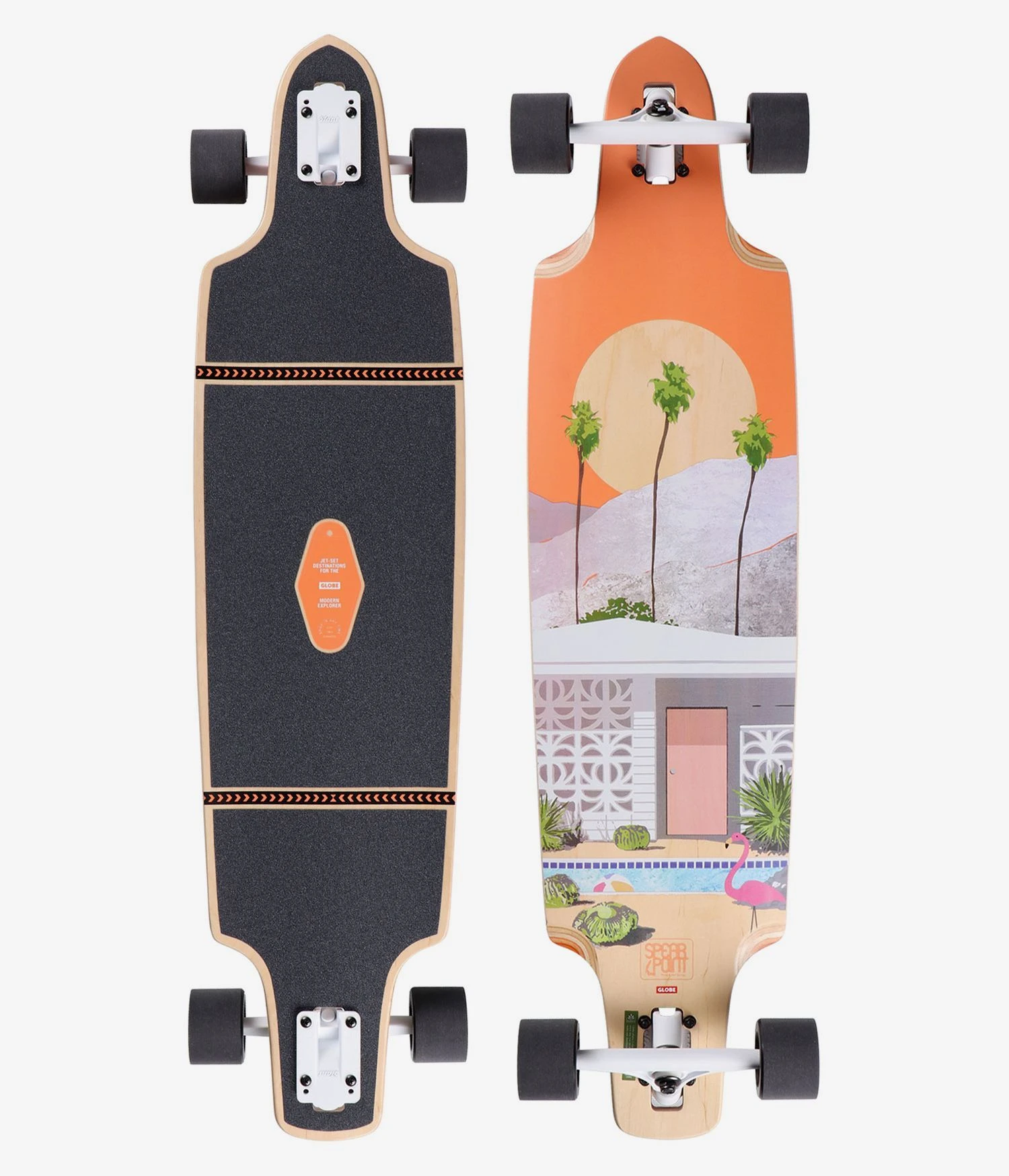 Directional cut away longboard met drop-through trucks en lichte concave van links naar rechts. De Spearpoint in Lodge is een 40″ inch down-hill en cruising longboard met hard rock maple 8-ply deck met artwork van hoofdartiest Sterling Bartlett. Met 180mm Slant reverse kingpin longboard trucks met omkeerbare 50/54 graden hangers – ze komen op 50 graden voor stabiliteit bij hoge snelheden, of kunnen worden omgedraaid naar 54 graden voor nog strakkere bochten. Globe’s high-rebound 70mm 78a Conical Cruiser-wielen zijn slijtvast, soepeler, sneller, en bieden uitstekende grip. Afgewerkt met zwarte gestanste grip tape met top art.