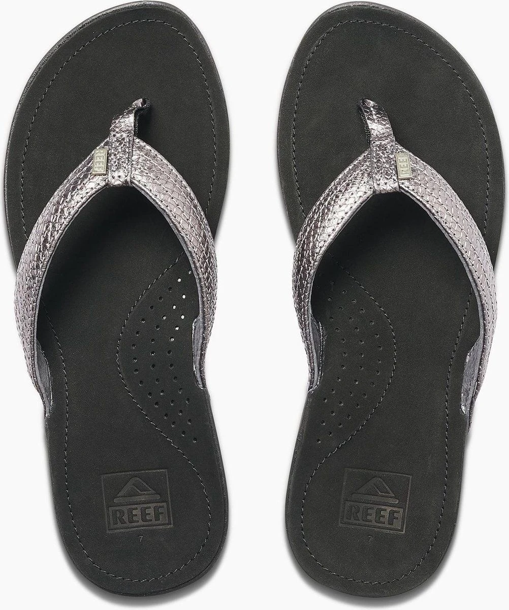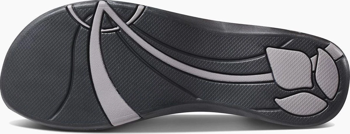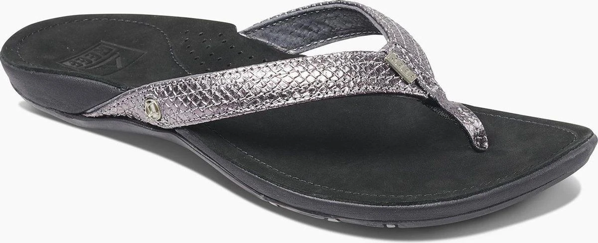 Uit de collectie van het merk Reef is deze comfortabele slipper Miss J-Bay. Dit zwarte model met metallic look en snakeprintje heeft een gekussende wReefband van volnerf ISA Lite leer, waardoor de slipper een geringere belasting voor het milieu is. Het drievoudig EVA-voetbed loopt niet alleen heel comfortabel door de anatomische holtesteun, maar is ook erg duurzaam doordat hij is gemaakt van 51 procent gerecycled materiaal met een toplaag van ISA Lite leer. De zool is van 25 procent gerecycled rubber en heeft een grof profiel met het Reef tulp-logo. De perfecte én milieubewuste slipper voor optimaal comfort tijdens ieder avontuur.