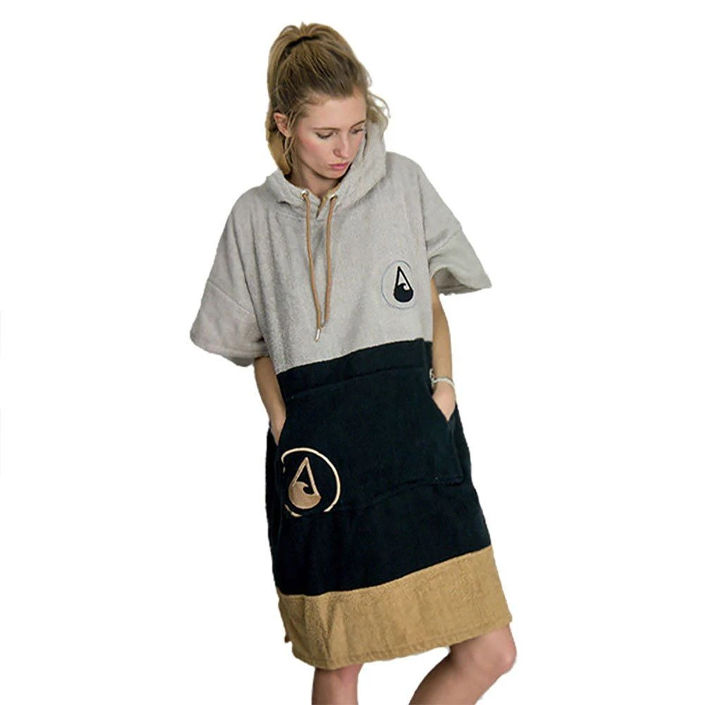 Comfortabele poncho in maat M/L gemaakt van 100% katoen, gecertificeerd volgens Oeko Tex Standard 100. Aangenaam op de huid en functioneel zoals gewoonlijk. Tweelaagse, bijzonder warme capuchon met hoge kraag, koord en metalen oogjes. De twee voorzakken bieden ruimte voor keukengerei zoals shampoo of borstel of je koude handen. Een echte blikvanger. De zorgvuldig geselecteerde stoffen zijn bijzonder donzig en huidvriendelijk. Duurzaamheid en natuurlijkheid bij de keuze van de grondstoffen spelen bij ons een grote rol – niet alleen in het belang van uw huid. Of het nu na het douchen is – tijdens het sporten en thuis, in het zwemparadijs, in de thermen, tijdens de watersport, in de sauna, in de fitnessstudio, tijdens het kamperen etc. Je poncho houdt je altijd lekker warm, gaat niet weg je staat in de regen en houdt je als mobiele kleedkamer bij het omkleden tegen nieuwsgierige blikken. Gemakkelijk schoon te maken, wasbaar in de machine en geschikt voor de droger.